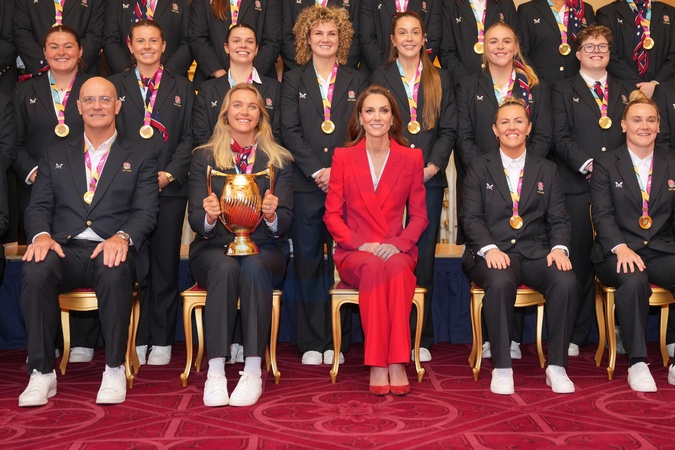 Britain's Kate, Princess of Wales, poses with members of the England Women's rugby team, at Windsor Castle, Windsor, England, Thursday, Jan. 15, 2026, the team won the 2025 Women's Rugby World Cup., Credit:Kin Cheung / Avalon