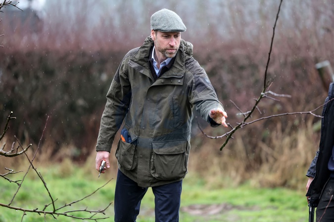 The Prince of Wales helps prune the trees in an apple orchard as he visits a family run farm by John and Laura Bowler in Herefordshire as patron of "We Are Farming Minds” a Herefordshire based charity which is committed to supporting farmers and promoting good mental health among the farming community across the UK., Credit:RICHARD POHLE / Avalon