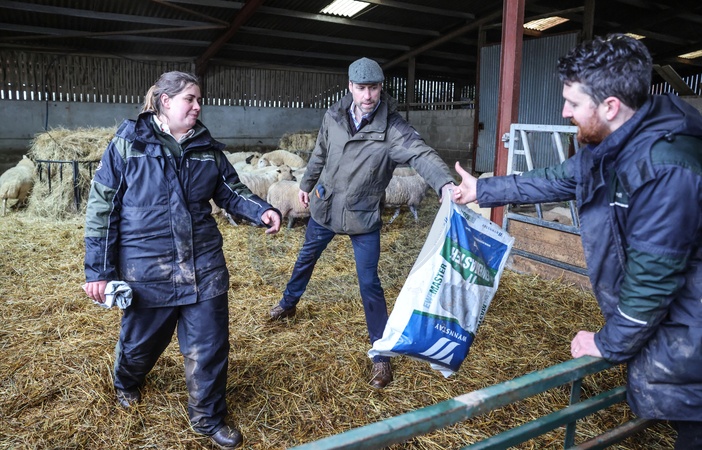 The Prince of Wales feeds sheep in a shed on a family farm run by John and Laura Bowler in Herefordshire as patron of "We Are Farming Minds” a Herefordshire based charity which is committed to supporting farmers and promoting good mental health among the farming community across the UK., Credit:RICHARD POHLE / Avalon