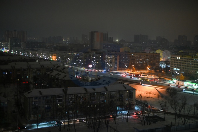 Darkened apartment buildings are seen during emergency electricity outages in Kyiv, Ukraine, on January 14, 2026. The city continues to face emergency power outages after Russian attacks damaged energy infrastructure, with outages lasting around 10 hours and power supply restored for about three hours, Credit:Yevhen Kotenko / Avalon