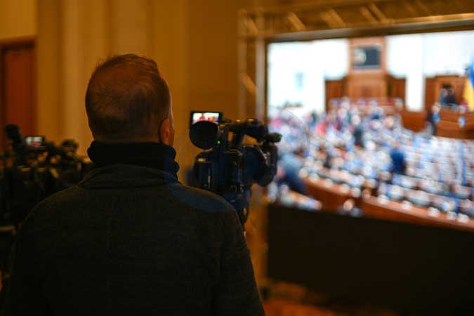 A camera operator works behind a video camera during the recording of a broadcast of a regular plenary session of the Verkhovna Rada of Ukraine at the parliament press center in Kyiv, Ukraine, on January 15, 2026, Credit:Yevhen Kotenko / Avalon