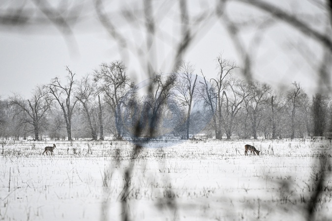 Roe deer graze amid snow on Khortytsia Island in Zaporizhzhia, Ukraine, on January 13, 2026, Credit:Dmytro Smolienko / Avalon