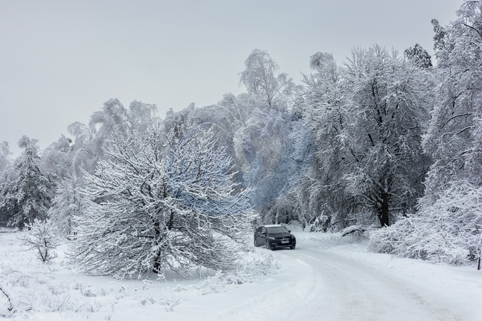A car drives along a snow-covered road čí a forest in Kyiv region on January 15, 2026, Credit:Olena Khudiakova / Avalon