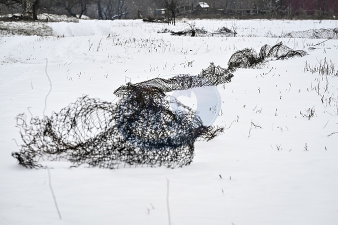 An armored metal mesh that once served as a fence protrudes from the snow on Khortytsia Island in Zaporizhzhia, on January 13, 2026, Credit:Dmytro Smolienko / Avalon