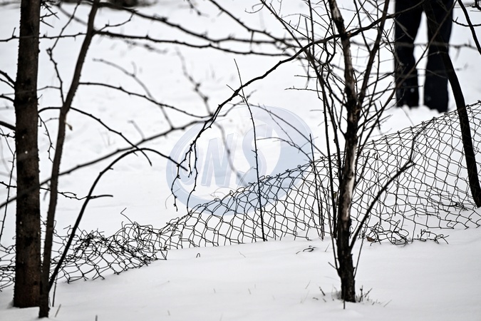 An armored metal mesh that once served as a fence protrudes from the snow on Khortytsia Island in Zaporizhzhia, on January 13, 2026, Credit:Dmytro Smolienko / Avalon