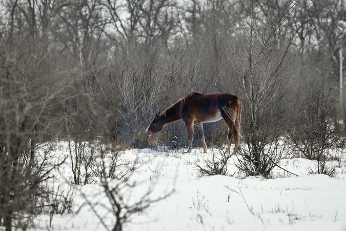 A horse feeds on young branches during winter grazing on Khortytsia Island in Zaporizhzhia, on January 13, 2026, Credit:Dmytro Smolienko / Avalon