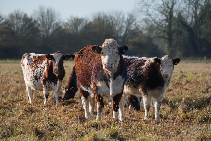 Hereford Cattle and bull on rich fen land soils in January.Ely, Cambridgeshire. United Kingdom. 14 January 2026, Credit:Mark Fairhurst / Avalon