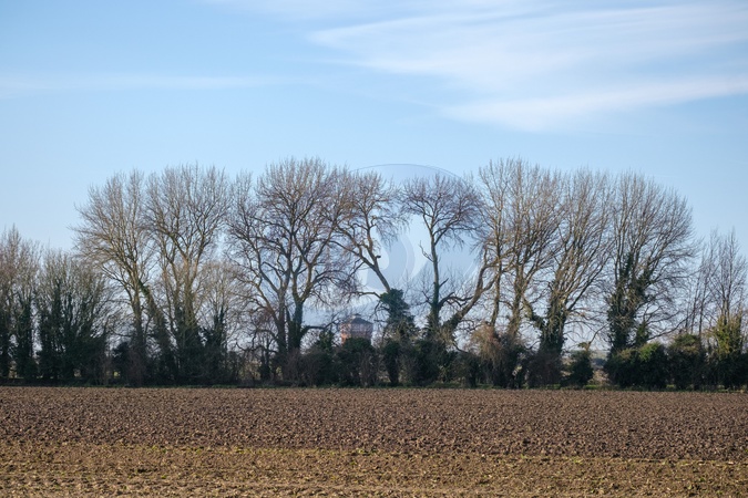 Rich fenland soils protected from winds by a boundary of trees. Ely, Cambridgeshire, UK.