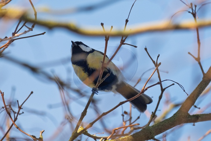 Blue tit, Cyanistes caeruleus, amongst branches on edge of farmers field. Ely,Cambridgeshire, UK.