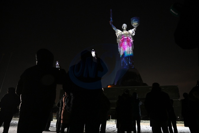 The Motherland Monument is illuminated with the flags of the United Kingdom and Ukraine and the Century Partnership logo during a symbolic light display held to mark the anniversary of the signing of the Century Partnership Agreement between Ukraine and the United Kingdom, Kyiv, Ukraine, on January 15, 2026. The Century Partnership logo symbolizes unity through national flowers: sunflower for Ukraine, rose for England, daffodil for Wales, thistle for Scotland, and flax for Northern Ireland, Credit:Yevhen Kotenko / Avalon
