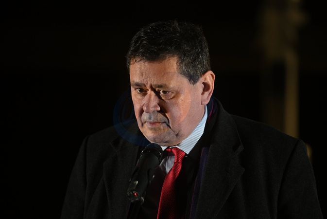 British Ambassador to Ukraine Neil Crompton delivers a speech during a symbolic light show as the Motherland Monument is lit with the flags of the United Kingdom and Ukraine and the Century Partnership logo on the anniversary of the signing of the Century Partnership Agreement between Ukraine and the United Kingdom, Kyiv, Ukraine, on January 15, 2026. The Century Partnership logo symbolizes unity: the sunflower represents Ukraine, the rose England, the daffodil Wales, the thistle Scotland, and flax Northern Ireland, Credit:Yevhen Kotenko / Avalon