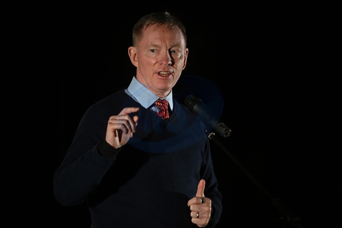 British Labour Party politician Chris Bryant delivers a speech during a symbolic light show in which the Motherland Monument is illuminated with the flags of the United Kingdom and Ukraine, as well as the logo of the Century Partnership, marking the anniversary of the signing of the Century Partnership Agreement between Ukraine and the United Kingdom, Kyiv, Ukraine, on January 15, 2026. The Century Partnership logo symbolizes unity: the sunflower represents Ukraine, the rose England, the daffodil Wales, the thistle Scotland, and flax Northern Ireland, Credit:Yevhen Kotenko / Avalon