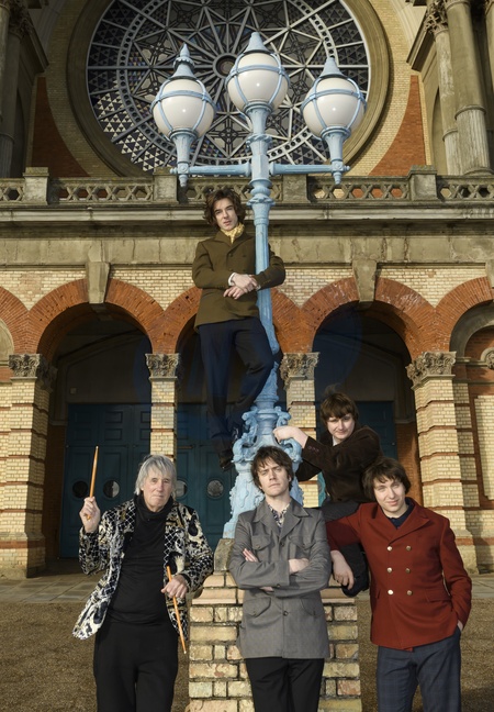 The Kinks musical Sunny Afternoon cast pose in Alexandra Palace , 16 January 2026. SUNNY AFTERNOON runs at Alexandra Palace until 31 January 2026, as part of its UK tour. Picture shows (left to right): Mick Avory., Oliver Hoare (Dave Davies)., Danny Horn (Ray Davies), Harry Curley (Peter Quaife) and Zakarie Stokes (Mick Avory), Credit:Tina Korhonen / Avalon