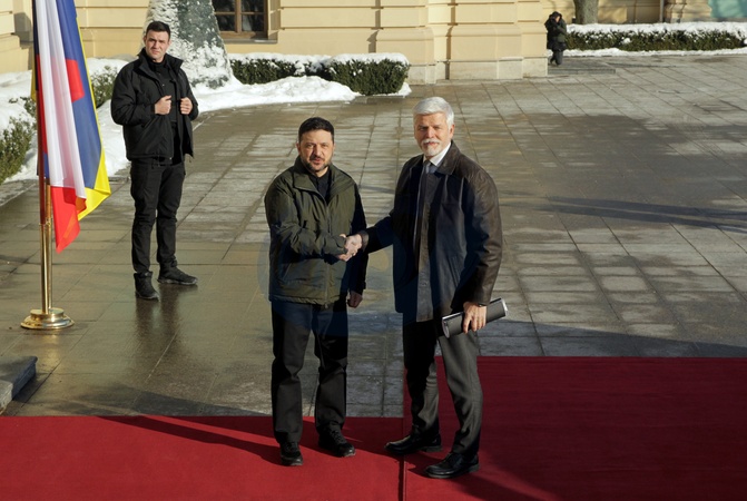President of Ukraine Volodymyr Zelenskyy (L) shakes hands with President of the Czech Republic Petr Pavel during a welcome ceremony outside the Mariinskyi Palace in Kyiv, Ukraine, on January 16, 2026., Credit:Hennadii Minchenko / Avalon
