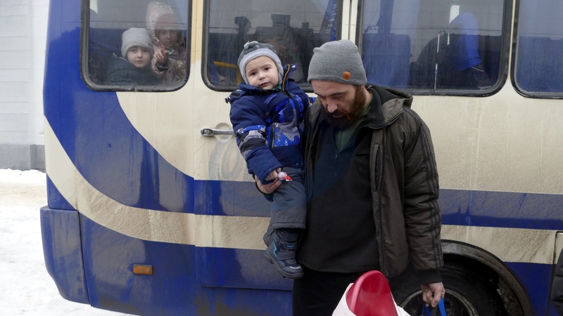 A man who arrived from a frontline area by evacuation train carries a boy onto a bus for further evacuation at the Mukachevo railway station, Mukachevo, Zakarpattia Region, on January 15, 2026. The train brought families from Zaporizhzhia Region, with a total of 39 evacuees, including 20 children. The youngest passengers were two infants born in 2025, Credit:Yulii Zozulia / Avalon