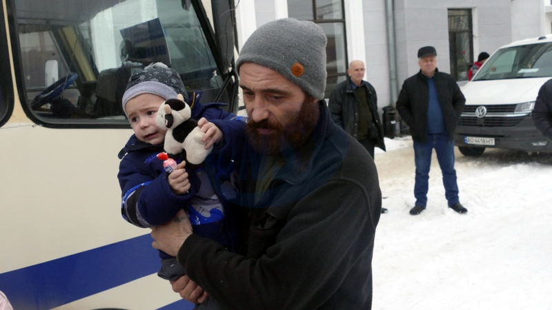 A man who arrived from a frontline area by evacuation train carries a boy onto a bus for further evacuation at the Mukachevo railway station, Mukachevo, Zakarpattia Region, on January 15, 2026. The train brought families from Zaporizhzhia Region, with a total of 39 evacuees, including 20 children. The youngest passengers were two infants born in 2025, Credit:Yulii Zozulia / Avalon