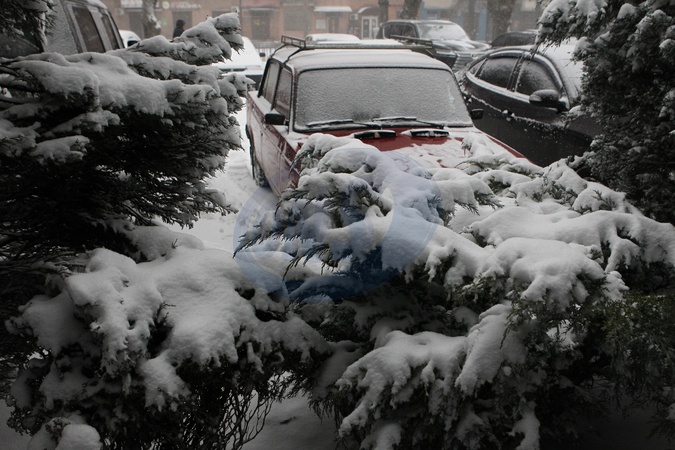 Cars dusted with snow are behind snow-covered evergreen bushes in winter, Dnipro, Ukraine, on January 11, 2026., Credit:Mykola Miakshykov / Avalon