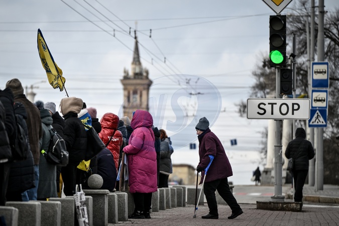 An elderly woman with a crutch and a cane participates in the "Don't Be Silent! Captivity Kills!" rally to remind people about the prisoners of war from the Mariupol garrison, captive and missing defenders of Ukraine in Zaporizhzhia, Ukraine, January 10, 2026., Credit:Dmytro Smolienko / Avalon