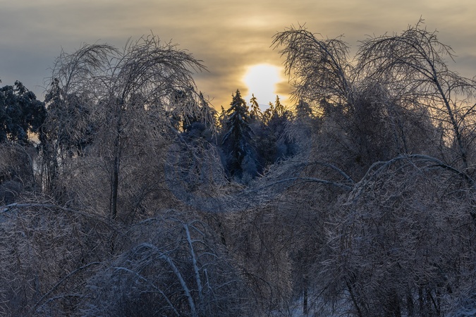 The setting sun illuminates ice-covered trees in the evening after a rare freezing rain that hit Kyiv and the region on January 8, Kyiv region, Ukraine, January 10, 2026., Credit:Olena Khudiakova / Avalon