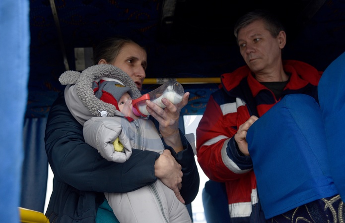 A woman who arrived from a frontline area by evacuation train feeds an infant with a bottle on a bus at the Mukachevo railway station, Mukachevo, Zakarpattia Region, on January 15, 2026. The train brought families from Zaporizhzhia Region, with a total of 39 evacuees, including 20 children. The youngest passengers were two infants born in 2025, Credit:Yulii Zozulia / Avalon
