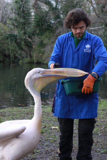 London, UK. 16 January 2026. Great white pelicans (Pelecanus onocrotalus) are seen at St James's Park on a sunny winter day as a Royal Parks keeper feeds the birds and visitors stop to watch and take photographs., Credit:Alexander Seale / Avalon