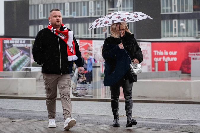 Sunderland fans walk in the rain towards the stadium prior to kick off during the Premier League match Sunderland vs Crystal Palace at Stadium Of Light, Sunderland, United Kingdom, 17th January 2026, Credit:Maynard Manyowa/News Images / Avalon