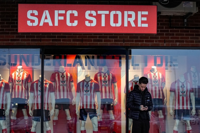A Sunderland fan stands outside a Sunderland Til I Die banner outside the club store at the stadium during the Premier League match Sunderland vs Crystal Palace at Stadium Of Light, Sunderland, United Kingdom, 17th January 2026, Credit:Maynard Manyowa/News Images / Avalon