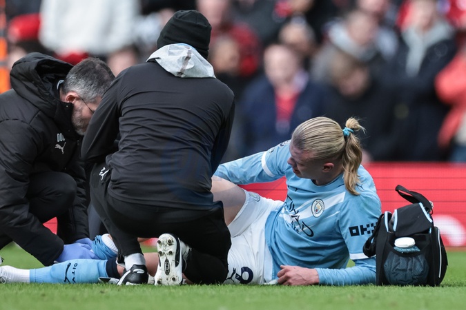 Erling Haaland of Manchester City receives treatment as the half time whistle blows during the Premier League match Manchester United vs Manchester City at Old Trafford, Manchester, United Kingdom, 17th January 2026, Credit:Mark Cosgrove/News Images / Avalon