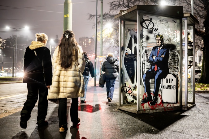 Republic Square, a new work by aleXsandro Palombo, near the U.S. Consulate General, titled MIGA – Make Iran Great Again. The mural depicts Donald Trump sitting on a tombstone with the inscription "Rip Khamenei," a gesture of support for the uprisings in Iran, amid widespread protests and numerous civilian casualties linked to the repression of the regime led by Ayatollah Ali Khamenei. Milan, Italy 16 January 2026, Credit:Nicola Marfisi / Avalon