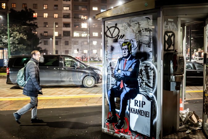 Republic Square, a new work by aleXsandro Palombo, near the U.S. Consulate General, titled MIGA – Make Iran Great Again. The mural depicts Donald Trump sitting on a tombstone with the inscription "Rip Khamenei," a gesture of support for the uprisings in Iran, amid widespread protests and numerous civilian casualties linked to the repression of the regime led by Ayatollah Ali Khamenei. Milan, Italy 16 January 2026, Credit:Nicola Marfisi / Avalon