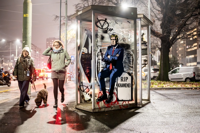 Republic Square, a new work by aleXsandro Palombo, near the U.S. Consulate General, titled MIGA – Make Iran Great Again. The mural depicts Donald Trump sitting on a tombstone with the inscription "Rip Khamenei," a gesture of support for the uprisings in Iran, amid widespread protests and numerous civilian casualties linked to the repression of the regime led by Ayatollah Ali Khamenei. Milan, Italy 16 January 2026, Credit:Nicola Marfisi / Avalon