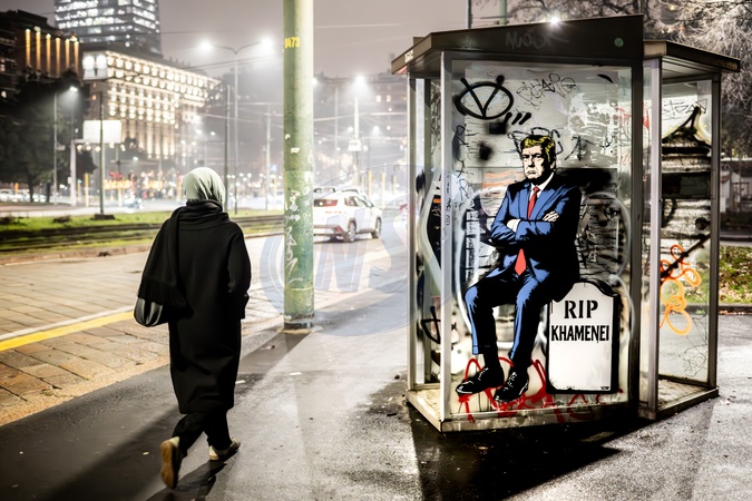 Republic Square, a new work by aleXsandro Palombo, near the U.S. Consulate General, titled MIGA – Make Iran Great Again. The mural depicts Donald Trump sitting on a tombstone with the inscription "Rip Khamenei," a gesture of support for the uprisings in Iran, amid widespread protests and numerous civilian casualties linked to the repression of the regime led by Ayatollah Ali Khamenei. Milan, Italy 16 January 2026, Credit:Nicola Marfisi / Avalon
