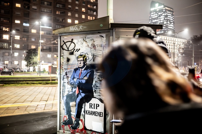 Republic Square, a new work by aleXsandro Palombo, near the U.S. Consulate General, titled MIGA – Make Iran Great Again. The mural depicts Donald Trump sitting on a tombstone with the inscription "Rip Khamenei," a gesture of support for the uprisings in Iran, amid widespread protests and numerous civilian casualties linked to the repression of the regime led by Ayatollah Ali Khamenei. Milan, Italy 16 January 2026, Credit:Nicola Marfisi / Avalon