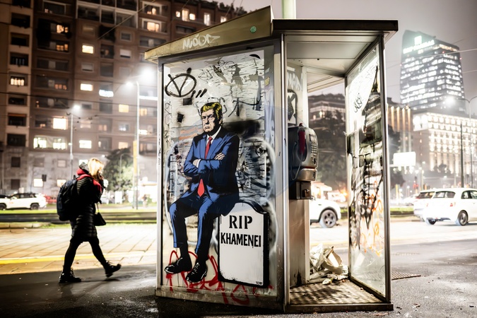 Republic Square, a new work by aleXsandro Palombo, near the U.S. Consulate General, titled MIGA – Make Iran Great Again. The mural depicts Donald Trump sitting on a tombstone with the inscription "Rip Khamenei," a gesture of support for the uprisings in Iran, amid widespread protests and numerous civilian casualties linked to the repression of the regime led by Ayatollah Ali Khamenei. Milan, Italy 16 January 2026, Credit:Nicola Marfisi / Avalon