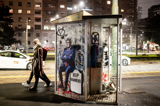 Republic Square, a new work by aleXsandro Palombo, near the U.S. Consulate General, titled MIGA – Make Iran Great Again. The mural depicts Donald Trump sitting on a tombstone with the inscription "Rip Khamenei," a gesture of support for the uprisings in Iran, amid widespread protests and numerous civilian casualties linked to the repression of the regime led by Ayatollah Ali Khamenei. Milan, Italy 16 January 2026, Credit:Nicola Marfisi / Avalon