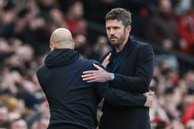 Pep Guardiola manager of Manchester City congratulates Michael Carrick interim head coach of Manchester United on his 2-0 win during the Premier League match Manchester United vs Manchester City at Old Trafford, Manchester, United Kingdom, 17th January 2026, Credit:Mark Cosgrove/News Images / Avalon