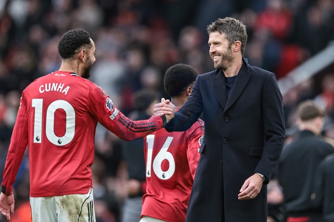 Michael Carrick interim head coach of Manchester United shakes hands with Matheus Cunha of Manchester United as they celebrate the 2-0 win during the Premier League match Manchester United vs Manchester City at Old Trafford, Manchester, United Kingdom, 17th January 2026, Credit:Mark Cosgrove/News Images / Avalon