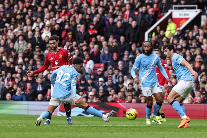 Bruno Fernandes of Manchester United shoots on goal during the Premier League match Manchester United vs Manchester City at Old Trafford, Manchester, United Kingdom, 17th January 2026, Credit:Mark Cosgrove/News Images / Avalon