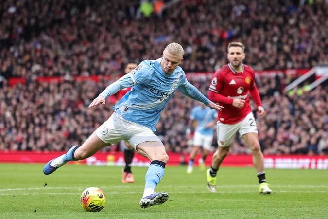 Erling Haaland of Manchester City shoots on goal during the Premier League match Manchester United vs Manchester City at Old Trafford, Manchester, United Kingdom, 17th January 2026, Credit:Mark Cosgrove/News Images / Avalon