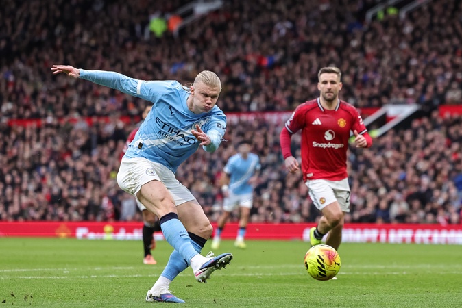 Erling Haaland of Manchester City shoots on goal during the Premier League match Manchester United vs Manchester City at Old Trafford, Manchester, United Kingdom, 17th January 2026, Credit:Mark Cosgrove/News Images / Avalon