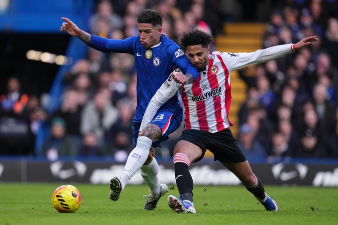 Enzo Fernandez of Chelsea and Kevin Schade of Brentford during the Premier League match Chelsea vs Brentford at Stamford Bridge, London, United Kingdom, 17th January 2026, Credit:Harvey Murphy/News Images / Avalon