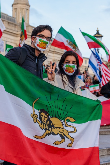 Trafalgar Square, London, UK. 17th January 2026.Thousands of Iranians and supporters lead the march from Trafalgar Square to the Iranian Embassy in protest of the mass killings of unarmed protesters in Iran. The now worldwide protests are calling for the end of the Islamic Republic and return of exiled Crown Prince Reza Pahlavi, the last Shah's eldest son., Credit:Photo by Amanda Rose / Avalon