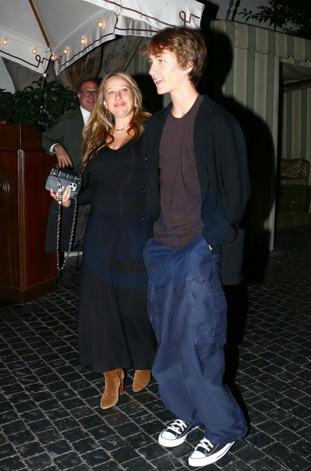 Jennifer Meyer, pregnant at 48, and her son Otis leave Chateau Marmont, Los Angeles, USA, 16 January 2026., Credit:MHD / Avalon
