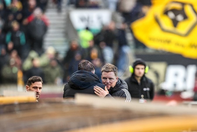 Rob Edwards manager of Wolverhampton Wanderers embraces Eddie Howe manager of Newcastle United before the game during the Premier League match Wolverhampton Wanderers vs Newcastle United at Molineux, Wolverhampton, United Kingdom, 18th January 2026, Credit:Ae Cosgrove/News Images / Avalon