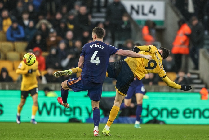 Jorgen Strand Larsen of Wolverhampton Wanderers is pushed down by Sven Botman of Newcastle United, no foul is given during the Premier League match Wolverhampton Wanderers vs Newcastle United at Molineux, Wolverhampton, United Kingdom, 18th January 2026, Credit:Ae Cosgrove/News Images / Avalon