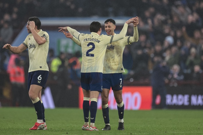 Nathan Patterson of Everton and Dwight McNeil of Everton celebrate the 0-1 win during the Premier League match Aston Villa vs Everton at Villa Park, Birmingham, United Kingdom, 18th January 2026, Credit:Mark Cosgrove/News Images / Avalon