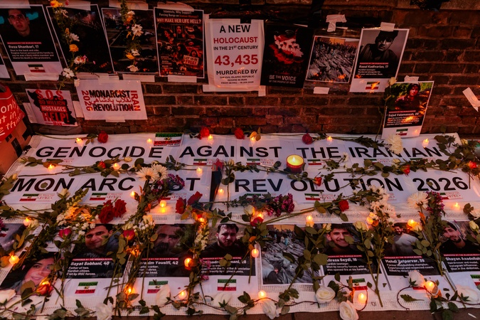 Iranian Embassy, London, UK. 18th January 2026.Thousands of Iranians continue to gather in front of the Embassy of the Islamic Republic of Iran, in protest of the reported violence, mass killings and arrests of the protesters in Iran and show support for the return of Crown Prince Reza Pahlavi.A memorial with lit candles and flowers in honour of the activists killed in the quest for freedom., Credit:Photo by Amanda Rose / Avalon