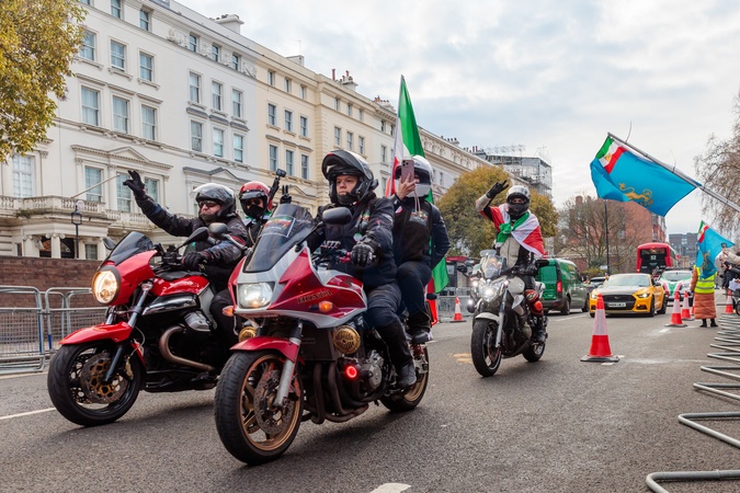 Iranian Embassy, London, UK. 18th January 2026.A convoy of motorbikes and cars, many draped with the historic Imperial 'Lions and Sun' flag of Iran, roar past the Iranian Embassy in London.Thousands of Iranians continue to gather in front of the Embassy of the Islamic Republic of Iran, in protest of the reported violence, mass killings and arrests of the protesters in Iran and show support for the return of Crown Prince Reza Pahlavi., Credit:Photo by Amanda Rose / Avalon