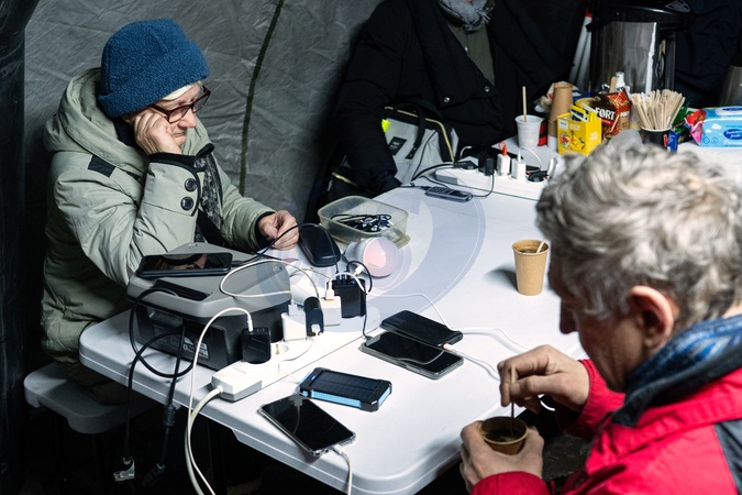 Kyiv residents charge their phones, lamps and flashlights and drink hot beverages at a mobile Point of Invincibility operated by the State Emergency Service of Ukraine and deployed in the Rusanivka residential area due to power and heating outages following another wave of mass attacks by Russia on the energy system of Ukraine, Kyiv, Ukraine, on January 18, 2026, Credit:Danylo Antoniuk / Avalon