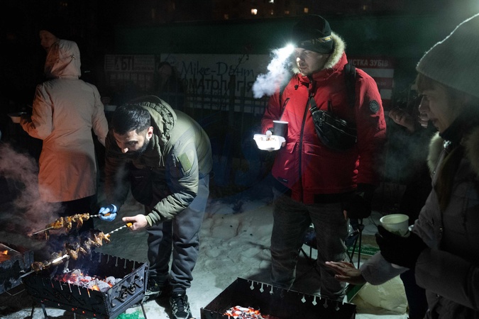 Kyiv residents warm up and cook foodon open flames amid blackouts